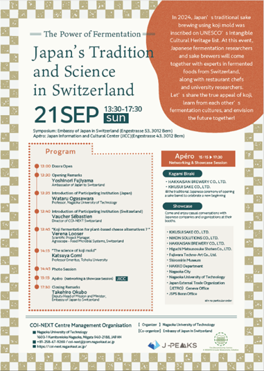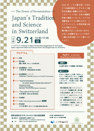 多様な文化が交差するスイスは、麹文化を世界に発信するための拠点となり得る地域です。本シンポジウムでは、こうした視点から日本の伝統的な発酵文化と日本酒の魅力を広く紹介し、日-スイス間における麹文化ネットワーク形成の第一歩を踏み出すことを目的としています。